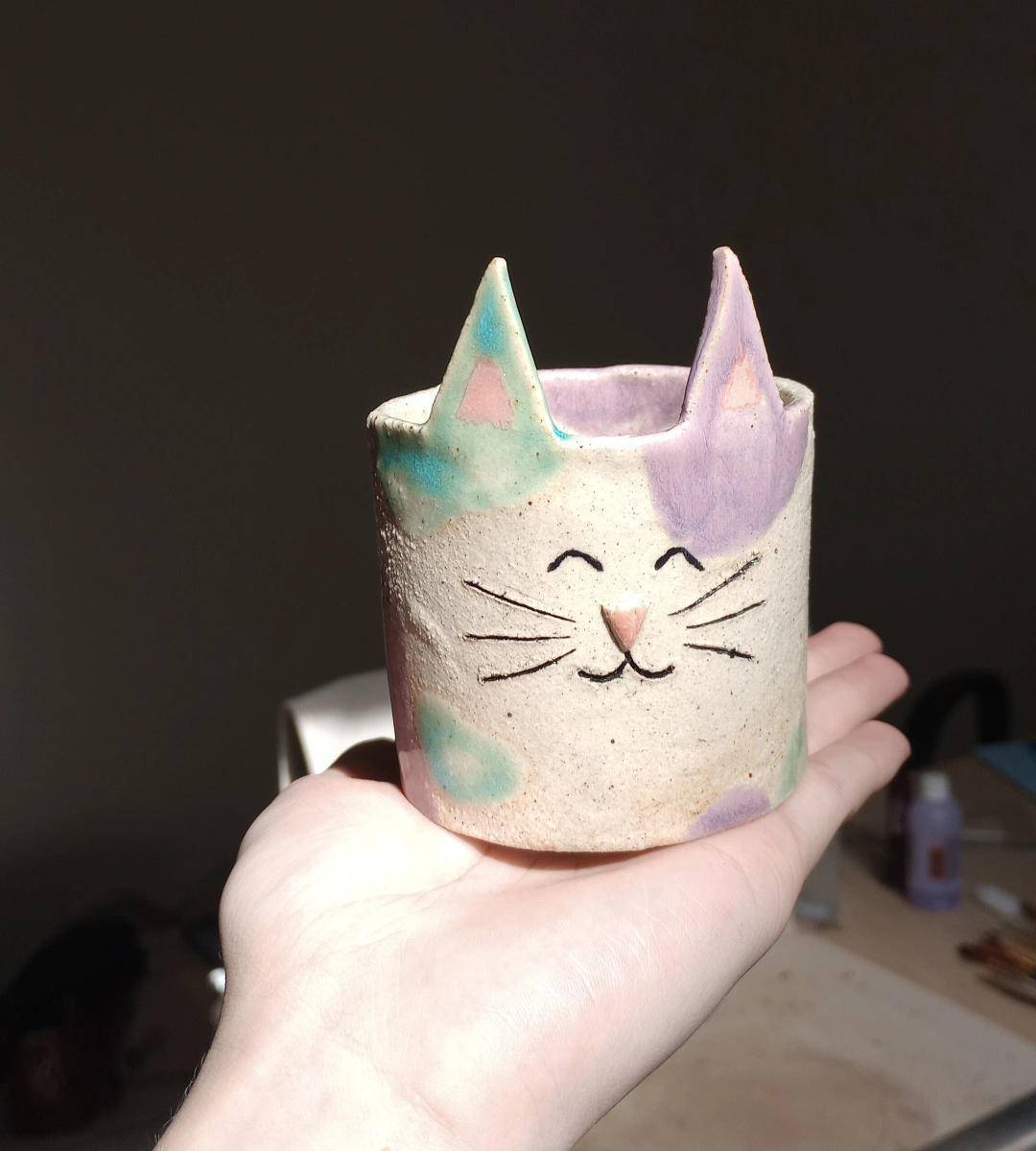 Adicione um toque de fofura e charme à sua mesa com o Porta Canetas Gatinho, uma peça artesanal única criada com amor e dedicação. Feito manualmente em cerâmica de alta qualidade, este porta canetas possui o formato de um adorável gatinho tricolor com detalhes coloridos em tons suaves de lilás e azul.